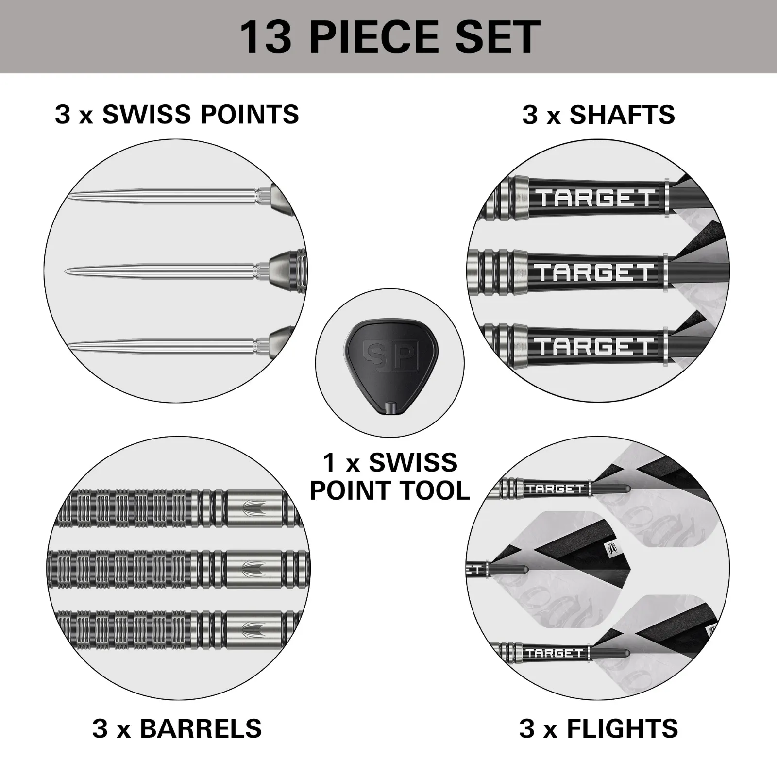 Utstyrt med sølvfargede Swiss Points og en sømløs nose-profil som reduserer bounce-outs og gir bedre feste i tavlen. Med Swiss Point-systemet kan spissene enkelt byttes ut på sekunder med det medfølgende SP-verktøyet – perfekt for å tilpasse seg ulike spilleforhold.
