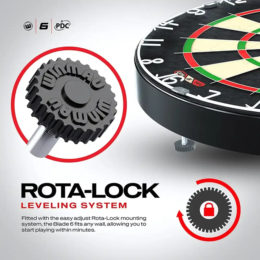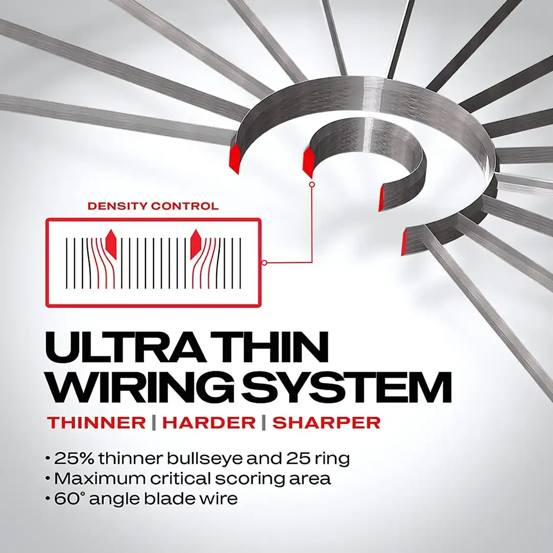 Med Blades velkjente web-design og Density Control™-teknologi får du optimal fibertetthet i de viktigste scoringsonene – doble, trebler og bull – for bedre dartretensjon og høyere scoringpotensial. Et ultratynt 60° vinklet wiresystem leder pilene inn i feltene og reduserer bounce-outs betydelig. Bull og outer bull er herdet og utstyrt med Density Control™-wire som er 25 % tynnere, noe som gir bedre presisjon og holdbarhet. Skiven monteres enkelt med Rota-Lock og tilpasses alle vegger, så du er klar til å spille på få minutter. Laget av førsteklasses østafrikansk sisal, turneringsgodkjent og produsert etter World Darts Federation-spesifikasjoner.